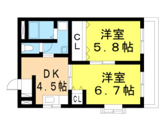| 間取り詳細 | 洋室6.7畳 、 洋室5.8畳 、 DK4.5畳 |